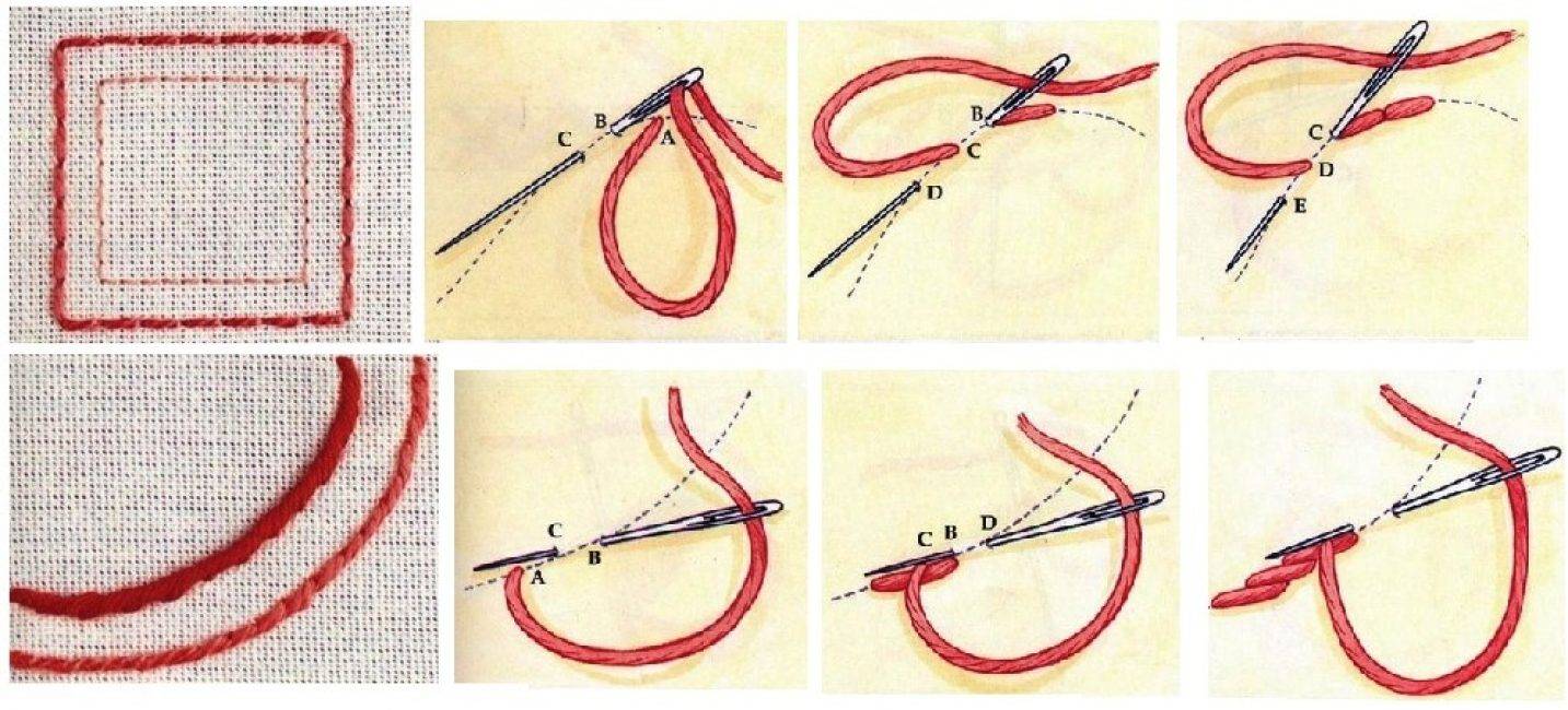 стебельчатый стежокиспользуют для тонкого орнамента или стеблей цветов; состоит из сильно наклоненных косых стежков, примыкающих друг к другу