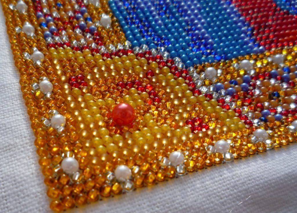 - Бисером, нашиваемым на изделие украшения в виде узоров, орнамента или тематического сюжета. В работе используется плотная основа и тонкая нить. Бусинки могут быть разного цвета, размера, фактуры, степени прозрачности и качества.