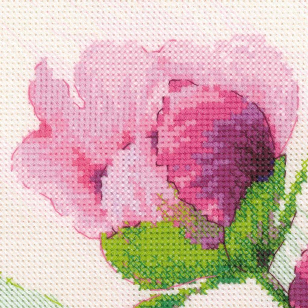Вышивка крестиком букета пионов потребует меньше усилий, если схема будет обучающей. Такие наборы включают в себя канву, на которой уже есть перенесенное изображение. Вышитое изображение содержит минимальное количество ошибок. Но его качество все равно можно оспорить. Недостатки обучающих наборов: