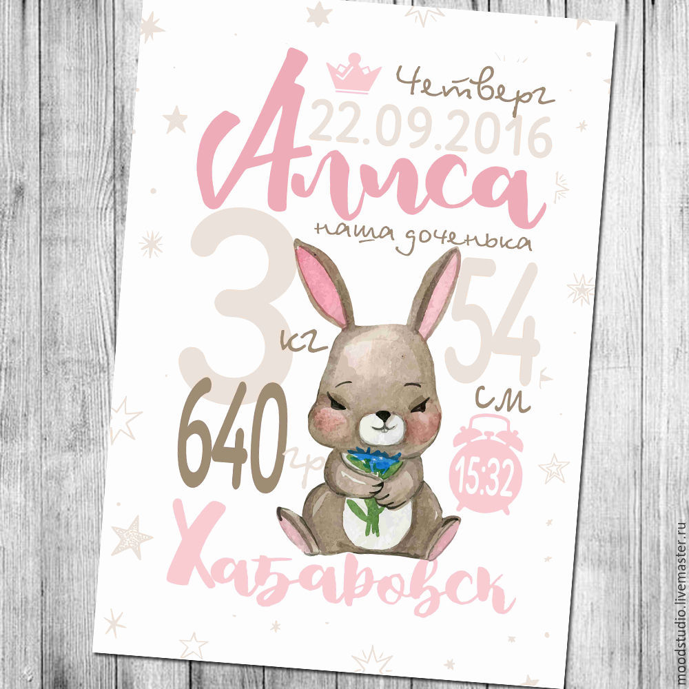 К примеру, потрет младенца и приветственные слова в его адрес. Или зайка в колыбельке и дата рождения малыша, а также какие-то милые вьющиеся растения, как обрамление картины