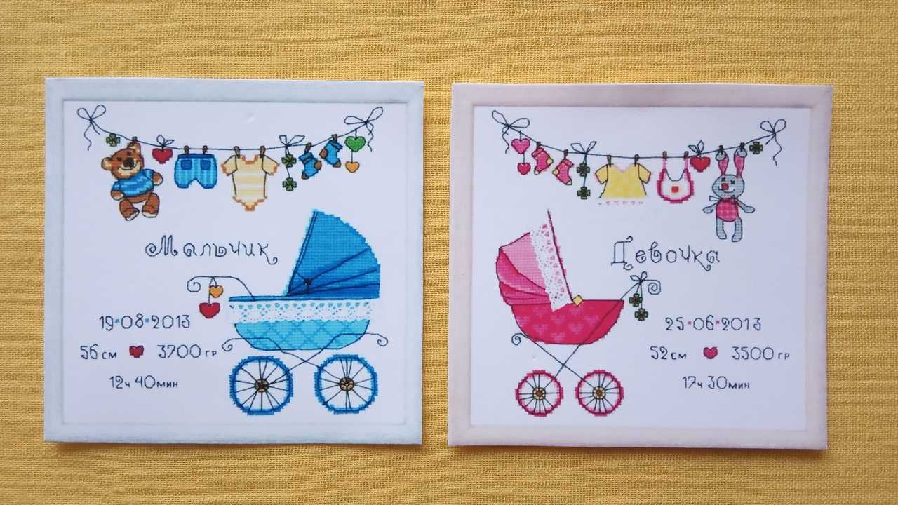 Если вы вышиваете подобную открытку, где засвидетельствовано рождение мальчиков или девочек, вы оставите там место для вышивки важных данных – это имя ребенка, дата рождения, возможно, рост и вес. Выглядит это мило, красиво, внешне такая вышивка напоминает трогательную картинку. И место в доме для нее всегда найдется.