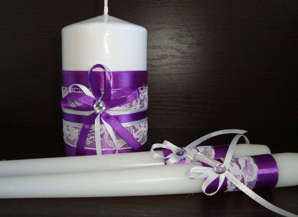 Свечи широко используются для убранства банкетного зала. Они также нужны для церемонии зажжения семейного очага. В качестве нашивки используются те же материалы, что и для бокалов, также можно дополнить наличием маленьких искусственных цветов или росписью. Свечи ставятся в обычные стеклянные банки, украшенные кружевом или лентой. Если праздник проходит в кафе, нужно поинтересоваться у хозяев о том, можно ли зажигать свечи.