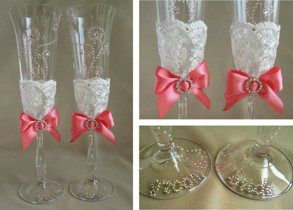 Для декорации бокалов преимущественно используются атласные ленты. Исходя из тематики праздника, это сочетание белого и пастельных тонов, которые смотрятся очень нежно и гармонично. Лоскутками можно обмотать ножки бокалов, сделать небольшие розочки или просто наклеить на стекло. Также можно добавить бусинки и стразы.
