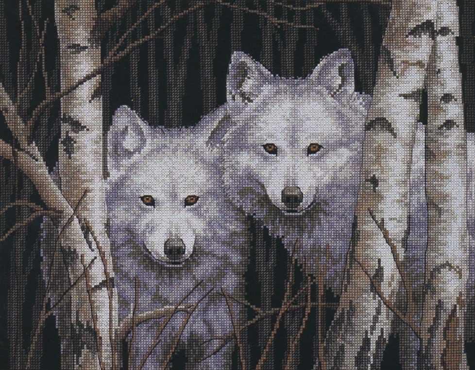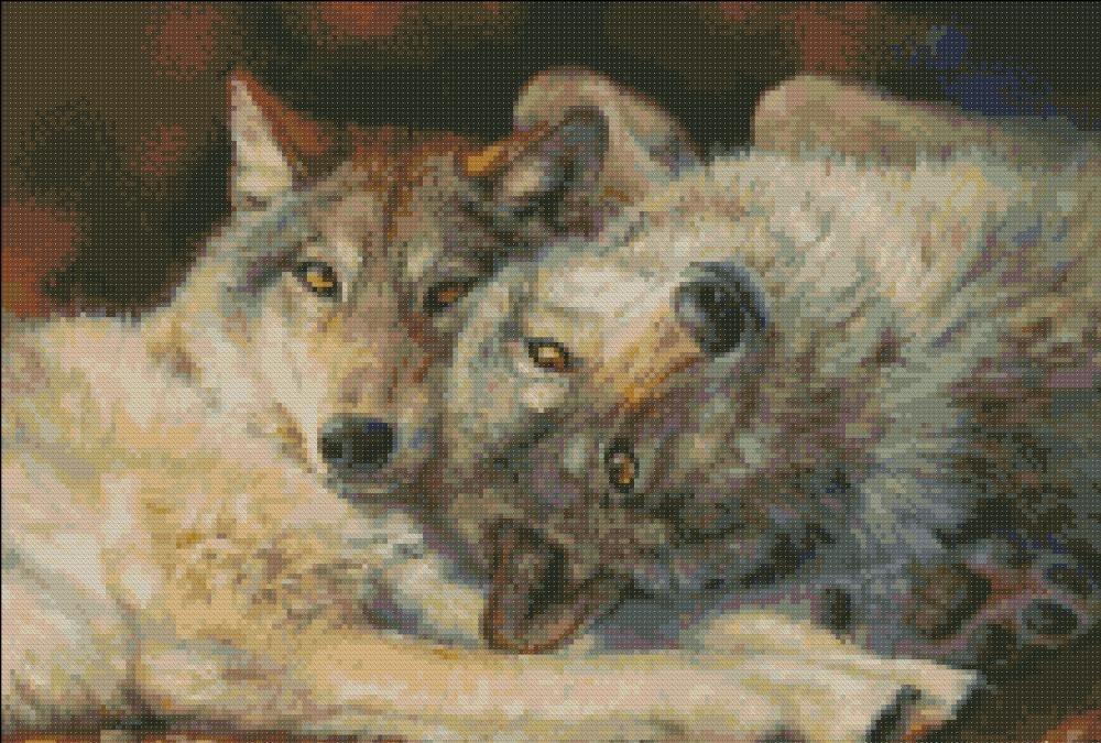 Разработанная DyanAllaire схема «Счастливая пара» заслужила популярность по всему миру. Её нельзя назвать лёгкой. Для выполнения автор рекомендует брать канву бежевого или кремового цвета №14 и вышивать нитью в 2 сложения. В общей сложности используется 38 цветов (отличаются друг от друга буквально на полутона), чтобы переходы были максимально плавными, а волки получились реалистичными. Размер готовой работы средний – 40 на 30 см.