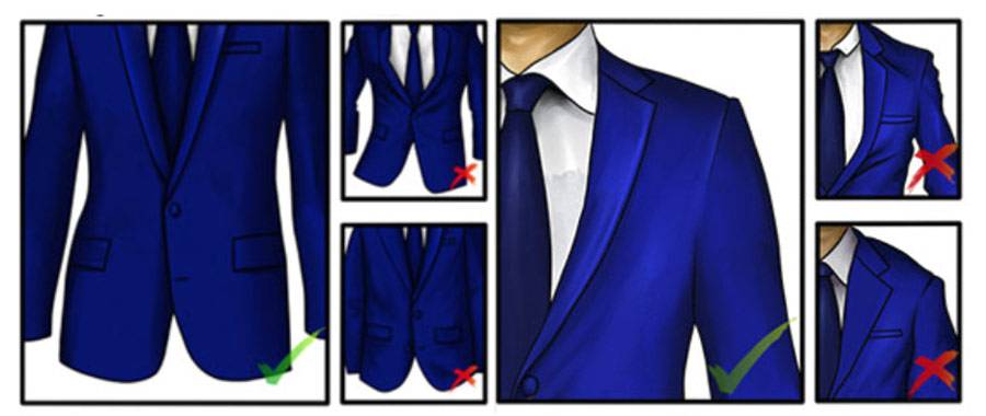 Оптимальной считается ширина пиджака, когда между тканью и телом проходит ладонь, не кулак. Однако, если Вы предпочитаете свободу действий и не любите ощущать скованность в движениях, подберите более широкую модель, но убедитесь, что в зоне груди не появился лишний объем.