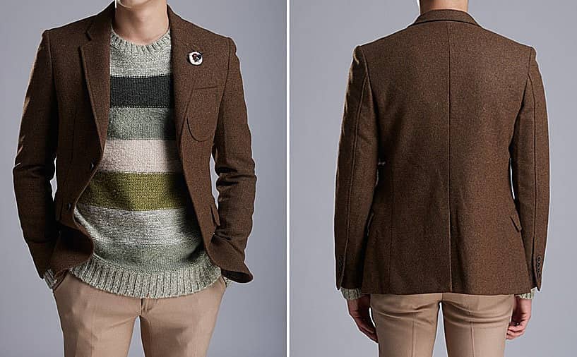 Для улучшения шерстяного полотна в его состав добавляют лайкру – такой пиджак более эластичный и не мнется. Достойную и стильную альтернативу шерстяным изделиям составляют пиджаки из твида, вельвета и кашемира. Твид прекрасно сочетается с трикотажем – такой мужской образ всегда остается модным.