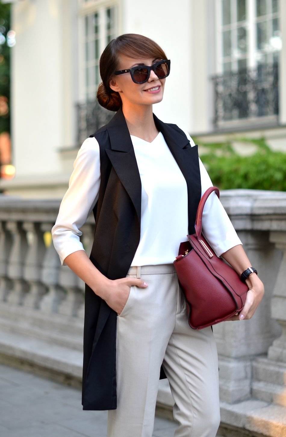 Белая водолазка (блузка с воротником) с классическими чёрными брюками прекрасно выглядит с длинным жилетом на 4 крупных пуговицах – отличное решение для офиса. Закончат деловой образ классические туфли-лодочки на средних или высоких каблуках.